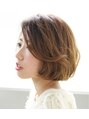 丸みが女性らしいボブのスタイルです。長めの前髪と、やわらかいカールで抜け感を出しました。