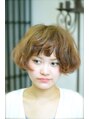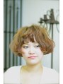 襟足ギリギリの、程よい重さのレトロボブ。短い前髪がポイント。オレンジ系とピンク系のカラーを、ランダムにスライシング。立体感と外国人風の計算された、あえてのまだら感を表現。大人気の低温コスメパーマでダメージレスでくっきりカーリーに!