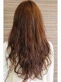 カラーはブラウン系の落ち着いたイメージで、耳下から少し強めにパーマをかけて柔らかいイメージのロングスタイルです。