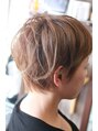 毛流れを見方にしたアシンメトリーなショート。流れる髪をあえて長く、そこにセクションからでグレイアッシュを被せてアクセントとしています。適度なクセがあるのでワックスで適当に仕上げて。
