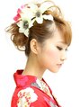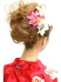 全体25ミリのコテで細かめにランダムで巻いて、トップにふわふわのカールがでるように、下は夜会巻であげて、フワフワアップ。帯は可愛いガーリー系の仕上がりにしました。