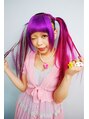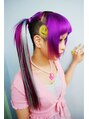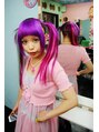 ブリーチはリタッチだけでまず薄い紫を全体に染めました。エクステは、紫をベースに片方はミント、もう片方は薄ピンク、そこにチラッとティンセルもいれました。刈り上げは、両サイドににこちゃんをいれて、バックはハートを赤でいれました。