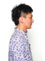 サイドのみ刈り上げてツーブロックにして、全体をセイムレイヤーにカットし毛先をイレギュラーにして長短をつけています。バランスを取りながら毛量調節し、スタイリングでアシメ風に。