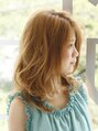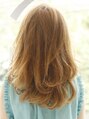 カット・鎖骨下5cmのレイヤースタイル。やわらかい動きが出るようにハサミを入れていきます。カラー・10レベルのゴールドブラウン。やわらかさが出ます。パーマ・無造作なカールが出るように大きめのパーマをかけます