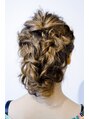 ミディアムの長さにコテ巻きし、トップは、くくりひねりほぐし技にサイドから三つ編み編み込みほぐしで真ん中にもってきて、そのまま襟足はフィッシュボーンほぐしで、毛先を丸め込みネジピンで留めました。カラーはカーキーアッシュベージュにハイライトON!
