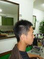 一秒でも早く!と言う陸上少年。ソフトモヒカンほど尖らせず自然な短髪にしました。前髪にクセがあるので、馴染むようにカット!