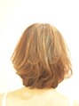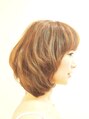 前下がりのボブベースで軽さと奥行きを。カラーはアプリコットベージュでふんわりとやわらかいイメージに…パーマはフェイスラインのみ中間まきで広がりすぎないふんわり感を演出しました。