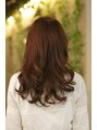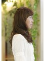 トップのみにレイヤーをいれ、ランダムにパーマかけた軽やかナチュラルセミディスタイル。肩上で動く毛先の抜け感がこのスタイルのポイント♪厚めにとった前髪を斜めにして斜めバング、おろすと甘めバングに。カラーはモーブベージュをオン。