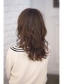 ベースは前上がりのレイヤースタイル。前髪は目ぎりぎりで下ろし流します。パーマは中間毛先にSウェーブが出るくらいの強さで外ハネメインになるようにかけます。カラーリングはやや暗髪のナチュラルベージュで落ち着いた爽やかな印象にします。