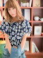 鎖骨ラインで弾むラフなカールが、ナチュラルでガーリーな雰囲気を醸し出してくれます♪少しパーマをかけた厚めバングで簡単スタイリング。ハイライトを入れてカジュアルさを。センターパート、斜めバングや、大人かわいいスタイルもご相談ください。
