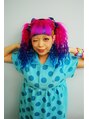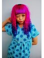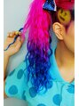 くれちゃんです。ブリーチして、ウェーブのエクステをつけて、刈り上げはパープルに、にこちゃん。全体は、フロントと毛先をターコイズ、 全体はピンク(20%)にしました。間がパープルになって綺麗なグラデーションになりました。。
