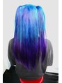 えみりちゃんです。刈り上げはブロックチェックにして、ブリーチをして上はアフターミッドナイトに毛先はショッキングパープルにしました。三本だけ、ティンセルを加えた黒のエクステをつけました。
