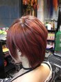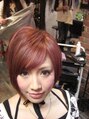 アシンメトリーのショートスタイルでございます。ピンクブラウンベースにハイライトを入れ、チェーリーピンクでコーティングした愛されカラー、個性派かわいいスタイルでございます。