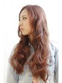 カットはすその重さを強調させる為に顔周りと表面にレイヤーを入れて軽くしています。大きめのルーズなカールをランダムに作り、ラフにくずします。カラーはオレンジとローズのミックスカラーで秋ヘアーに。