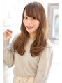毛先重めベースのローレイヤースタイル。バングはやや下ろしながらサイドにながし、中間から毛先にかけては大きめのカールでラフに。カラーは10レベルの柔らさを出したスモーキーベージュ。派手すぎず、可愛さある大人の女性を演出。