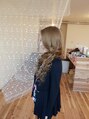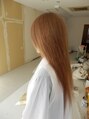 少し赤みが出やすい髪色に透明感を出すためハイトーンのオーガニック系カラーを使用。暗くなりがちな毛先とのカラーバランスを重視しました。