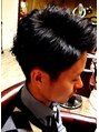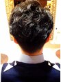 サイドにさりげなくツーブロックを入れて、ネープはシックに刈り上げてレトロモダンに!!パーマは少しラフなニュアンスを出しつつ、ツヤのあるまとまったスタイルです。「出来る大人な男!!」って感じですね(^^)