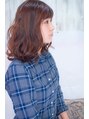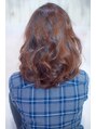 ミディアムヘアのカールスタイル。カラーレベルは9Lvの『アッシュブラウン』部分的にローライトを入れて立体的にしてます。前髪は流す事を考えて少し長く軽くしてます。