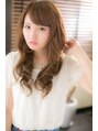 ややハイトーンのカラーに少し上からニュアンスパーマをかけて全体のボリューム感で小顔効果を