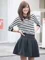 アウトラインは前上がりのラインを出し、軽さを出すために前下がりのレイヤーを入れました。バングは長めにし横に流しました。明るいイエロー系のカラーにマット系のエメラルドグリーンを入れ全体をトーンダウン。秋色に仕上げました。ハイライト入り。