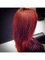カラーリング。ベースカラーはカッパーブラウンで染め、ビビットなローズレッドで太めのハイライトを全体に施しました。カット。7対3パートでかき上げスタイル、中間から毛先にかけ質感を程よく軽くし毛先に動きをもたせました。