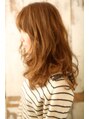 前上がりセミロングレイヤー。前髪を目の下で横に流しやすいようカット、全体をセニング&スライドカットで量感&質感調節。パーマは17mmから21mmで毛先ワンカール半平巻き外巻きMIX、TOPは平巻きでボリューム出す。色はシースルーベージュで柔らかさを出す