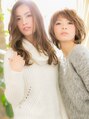 右:ランダムなミックスカールで無造作なクセ毛風に。フェアリーでリラクシーな雰囲気に仕上がります♪短めバングでキュートな抜け感を。 左:光をまとったツヤカラーと,胸元でゆらめくグラマラスカールで,女の子憧れの美人ヘアに。耳かけも大人かわいい◎