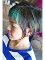 クレイジーカラーから新色登場です!今回はブルージェードをバングと毛流れのポイントになる部分に使用。全体を寒色系ダークトーンにまとめるとハイセンスに決まります。カットは骨格補正カットでザクザク感を表現しました。