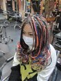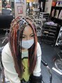 人毛エクステを全頭に付け、編み込みを長くし、ブレイズにしました。毛先は通常の状態です。