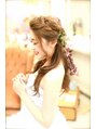トップを編み込みとねじりを組み合わせたスタイルです。飾りを個性的につけても可愛いですよ!花嫁さんにもオススメです!