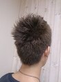 トップとサイドで質感にコントラストをつけたアクティブなショートスタイル。トップに遊びが出る長さに設定したツーブロックボウズ。カラーはグレーアッシュでより軽快で柔らかい仕上がりに。