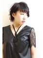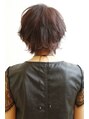 全体を9レベルのシアーモーブで染め、太めのスライシングでブラックを筋状にいれました。顔周りの印象を引き締め、ショートならではの毛流れを強調!少しウルフっぽい縦長ショートです!軽くパーマをかけてあげれば、女性らしい柔らかな質感も楽しめます!