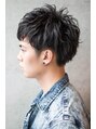 アウトラインを2ブロックにして前髪を流した流行デザインヘア。マッシュベースにすることで男らしい印象のなかに柔らかさも演出しています。