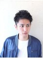 ハチ下をがっつり刈上げた短めショート。毛先にパーマでランダムな動きをつけ、男らしい雰囲気に。