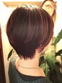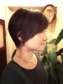 大きく流した前髪と、スッとコンパクトにまとまったバックとのメリハリを効かせたショートスタイルです♪表面にハイライトのカラーを入れる事で毛流れと立体感をより一層引き立てています☆