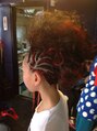 両サイド違うデザインのコーンロウをエクステをランダムに混ぜながら編み込んでモヒカン風にアップしたスタイル。