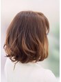 ボブのベースに、中間から毛先にゆるやかなウエーブを重ねて、やわらかい雰囲気に。カラーはクリアカラーに、赤味を消すライトグリーン系のカラートリートメントで、ケアをしながら色をのせました。