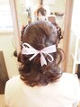 ヘアアクセサリーとしてリボンを編み込んでみました。アクセサリーのリボンと編み込みでのリボンのコラボ作品。遊び心のあるハーフアップです。