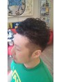 2ブロック部分を丁寧にバリカンで刈り上げ、全体にしっかりパーマをかけたエッジのきいたスタイル。ジェルワックスでウエットに艶をだし仕上げます。大人の男性だけでなく、お洒落なヘアです。