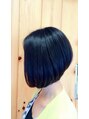 前髪が長めの前下がりボブスタイルです。暗めの髪だと一見重そうに見えますが、内側をかなり削っていますので、多毛の方でも挑戦しやすいです。仕事柄カラーができない方やちょっと大人っぽくしたい方などにおすすめです。