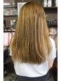 赤味が出やすい黒髪をミントアッシュで赤を打ち消しています。アイロンで巻いたとき、かきあげたときに立体感が出るようにメッシュを部分的に入れています。