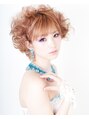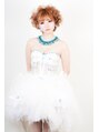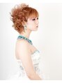 グラデーションカラーでオレンジカラーと毛先のイエローが光のようにキラキラとしたあたたかさと、ドレス・ネックレスのブルーが深い美しい海のような色でまるでドールのような美しいブライダルスタイルを演出しています。