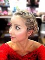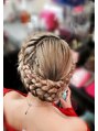 8.2パートで編み込みし、中央は下めに一束ネープをVラインになるように留める。 外人風にタイトにまとめてエレガントな感じに。
