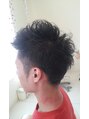 トップは長めに残しランダムな動きがでるように無造作な質感のパーマをかけ、サイドはツーブロックに刈り上げ。