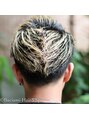 カラーはあえて根元を塗らずに毛先のみにブリーチをのせてオンカラー。カットはサイドからバックにかけてしっかり刈り込む。トップに関してはしっかりと隙間間をプラス。