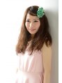 中間から毛先をストレートアイロンでウェーブをつくり、髪の長さをいかし柔らかい印象になるよう仕上げました。メイクはピンクのチークとリップを使い女子力かなりUPです!!!髪飾りをつけると、少し雰囲気が変わりますね。(青柳ハンドメイドです。)