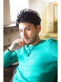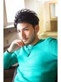 襟足とサイドは刈り上げてツーブロックにし、サッパリとした清潔感と、毛先を軽くし、髪の流れを出しやすくします。カールが大き目のゆるめパーマで動きを出し、カールとツヤで男のセクシーさを出しました。