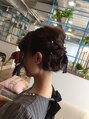 肩に付くくらいのロブ全体をカーラーで巻きくるりんぱとねじりのみのシンプルな構成ですがねじりを崩しながらピンで留める事で華やかさが増します。