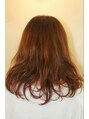肩下のローレイヤーでワンカールぐらいのゆるいパーマ。乾かし方やスタイリングの仕方で色々な表情が楽しめます。少し遊び心を出したくて、内側の毛先のみバイオレットを入れました。