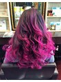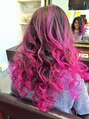 グラデェーションカラーメッシュを表面と毛先10センチにブリーチで色を抜いて、マニックパニックでグラデーションに色を重ねて藍色~バイオレット~ピンク